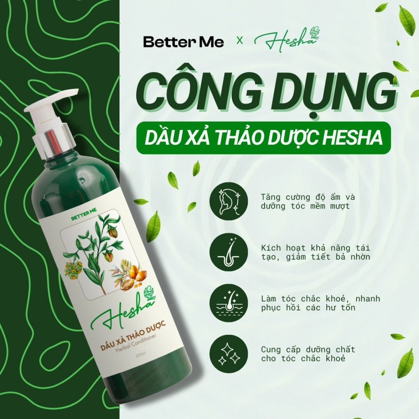 Dầu gội và dầu xả Hesha mang đến sự kết hợp hoàn hảo giữa khoa học hiện đại và nguồn dưỡng chất tự nhiên, giúp nuôi dưỡng mái tóc khỏe đẹp từ gốc đến ngọn. Với châm ngôn tận dụng sức mạnh thiên nhiên, sản phẩm không chỉ làm sạch mà còn bảo vệ và phục hồi tóc một cách an toàn và hiệu quả.
